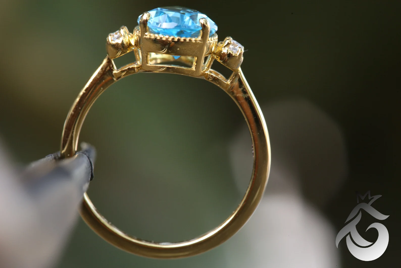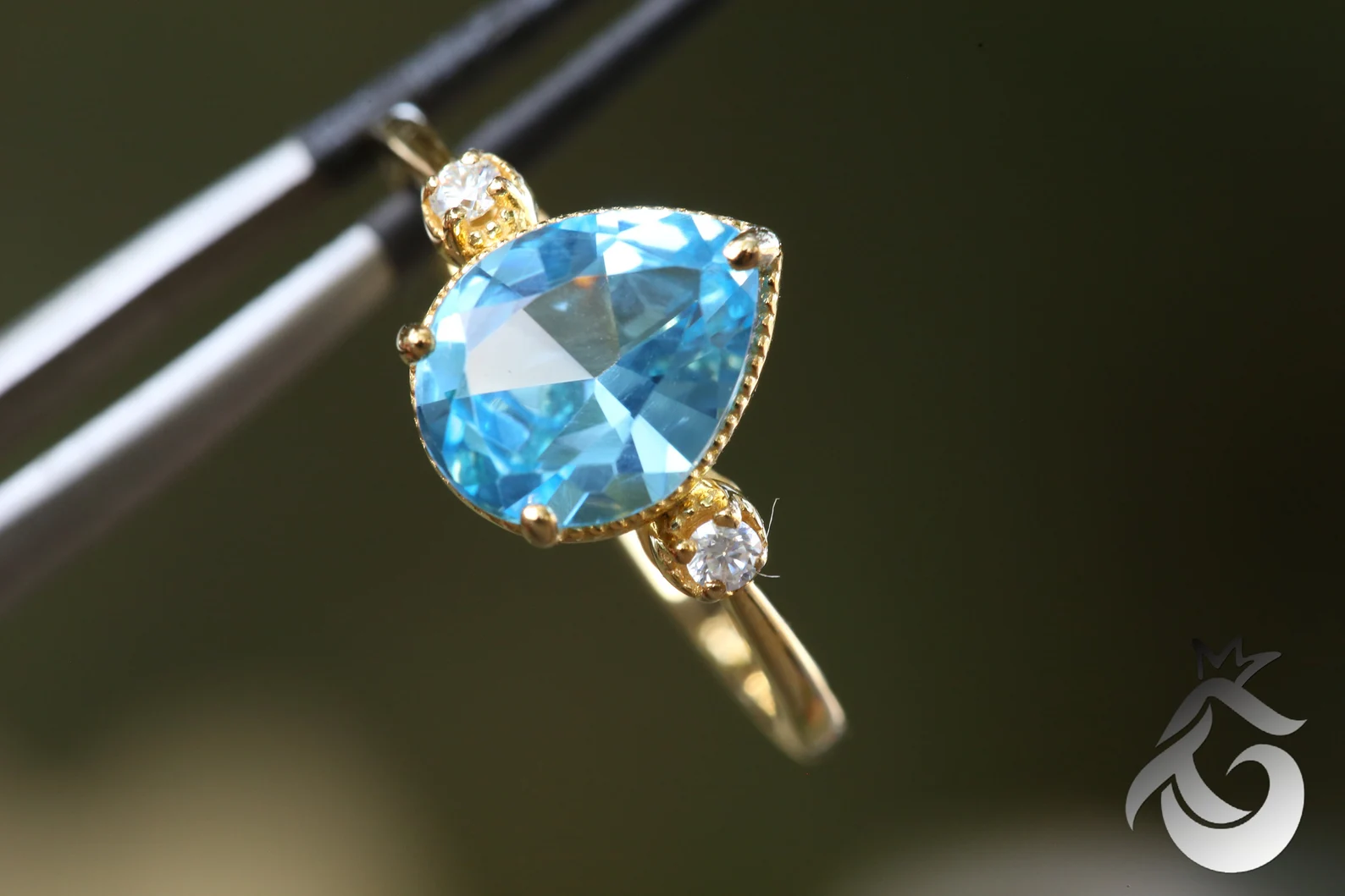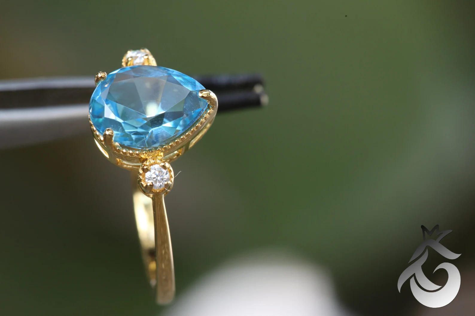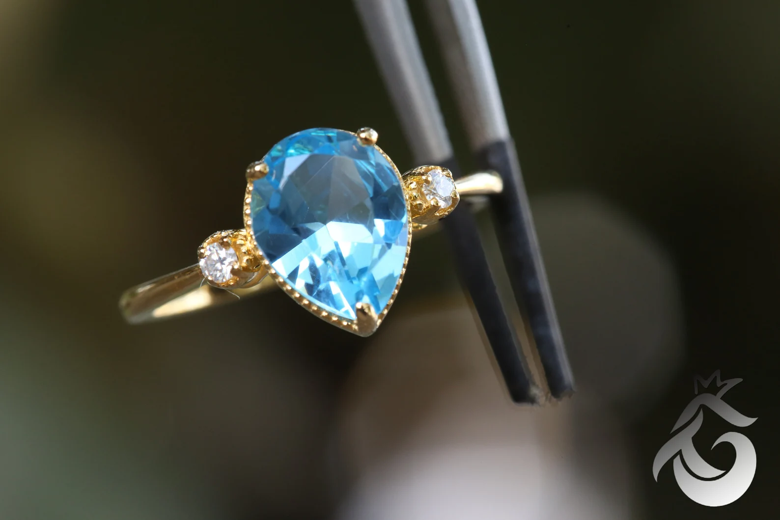 A striking pear-cut blue crystal set in a polished gold-tone band, accented with two small round-cut clear crystals for added brilliance. Designed with an elegant and feminine silhouette, this ring adds a beautiful pop of color and refined sparkle, perfect for both everyday wear and special occasions.