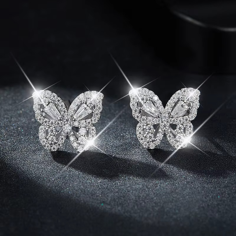 Beautiful butterfly-shaped stud earrings featuring sparkling clear crystals set in a polished silver-tone finish. A delicate fashion jewelry piece perfect for everyday wear or special occasions.