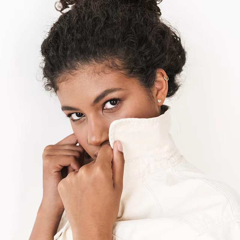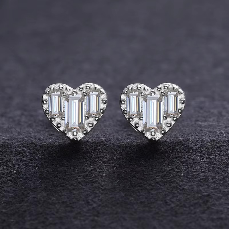 Elegant heart-shaped stud earrings featuring baguette and round clear crystals set in a polished silver-tone finish. A beautiful fashion jewelry piece perfect for everyday wear or special occasions.
